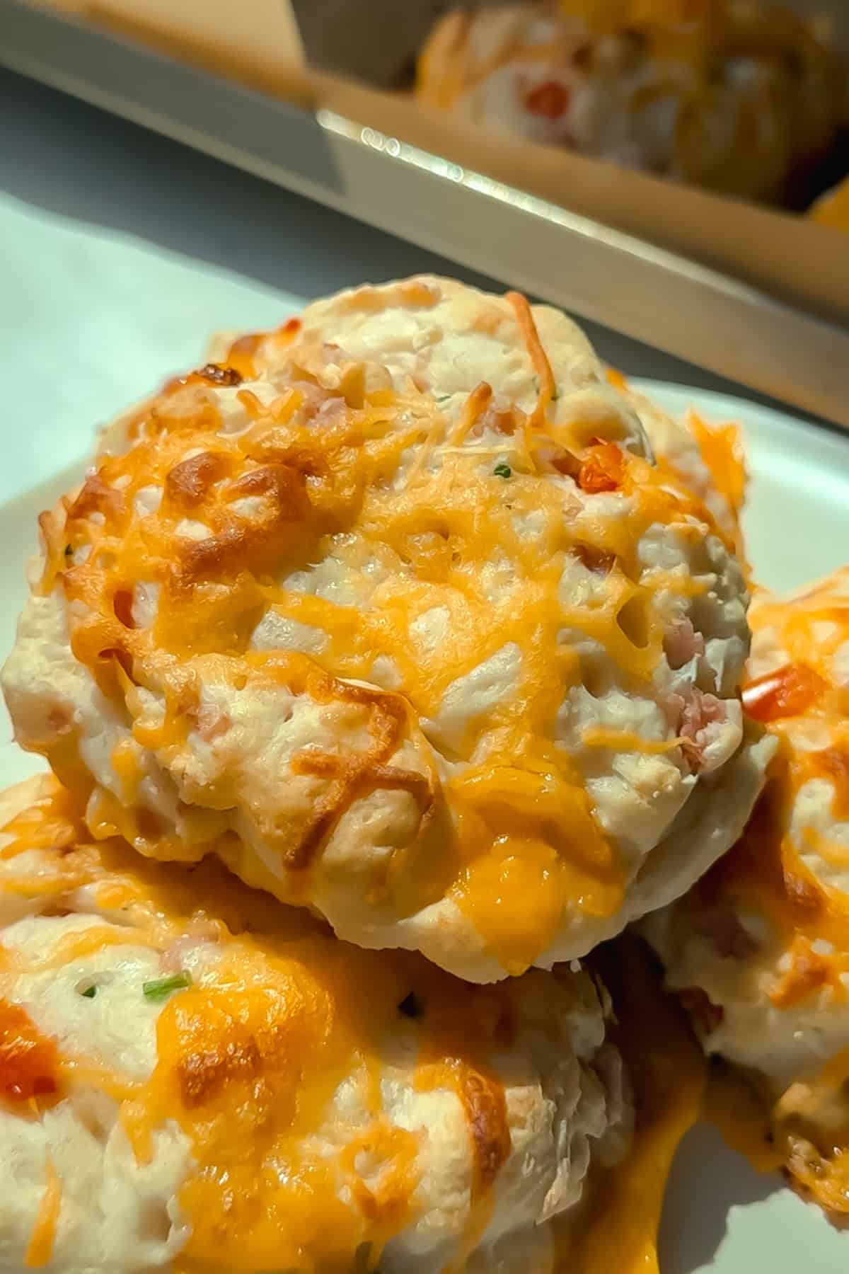 ระยะใกล้ของบิสกิตวิเศษสองตัวที่มีเชดดาร์ละลายอยู่ด้านบนวางบนจานสีขาวที่มีบิสกิตเบลอมากขึ้นในพื้นหลัง