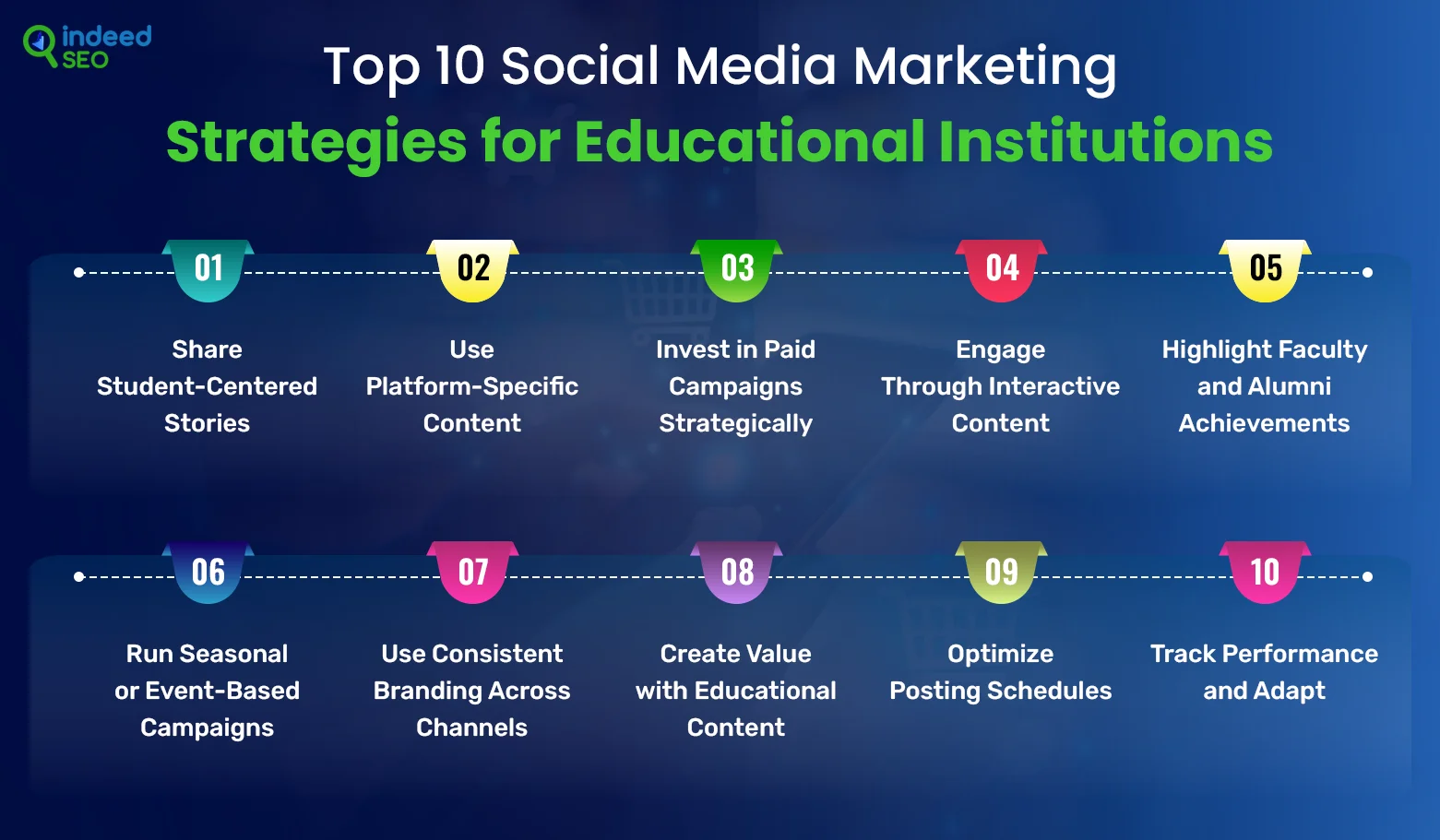 ที่นี่เราได้จดทะเบียนกลยุทธ์การตลาดโซเชียลมีเดีย 10 อันดับแรกสำหรับสถาบันการศึกษา กลยุทธ์เหล่านี้ออกแบบมาเพื่อเพิ่มการมีส่วนร่วมสร้างชุมชนและดึงดูดนักเรียน: