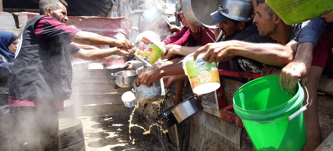 หลังจากการต่อสู้ที่ขมขื่น Ziad al-Ghariz ผู้สูงอายุที่พลัดถิ่นจากฉนวนกาซาสามารถรับซุปถั่วเลนทิลหนึ่งถ้วย เขานั่งอยู่บนพื้นและเริ่มจิบช้าๆ เขาบอก ข่าวของสหประชาชาติ ว่าเขาไม่ได้ชิมขนมปังเป็นเวลา 10 วันติดต่อกัน