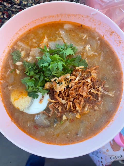 แต่ตอนนี้เรากำลังมุ่งหน้าสู่พื้นดินที่รู้จักกันดีมากขึ้น ลูกค้าจำนวนหนึ่งล้อมรอบผู้ขายรายหนึ่งให้บริการจานก๋วยเตี๋ยวปลาที่รู้จักกันในชื่อ Mohinga (aka“ อาหารประจำชาติของพม่า”) ได้เร็วที่สุดเท่าที่จะทำได้ เราพยายามสั่งซื้อ แต่เธอแสดงท่าทางที่โต๊ะแล้วรอบะหมี่ของพวกเขาแล้วเส้นที่รอนั่งที่โต๊ะนั้นต่อไป “ เราจะกลับมาในภายหลัง” เราพูดคิดในภายหลัง = บางครั้งในปีหน้า