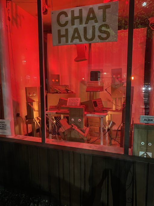 โดยเฉพาะอย่างยิ่งการแชท Haus เป็นงานศิลปะนิทรรศการโดยศิลปิน Brooklyn Nim Ben-Reuven– มันเป็นที่ตั้งของหุ่นยนต์กระดาษแข็งจำนวนหนึ่งที่ทำงานอยู่ที่คอมพิวเตอร์ผ่านการเคลื่อนไหวที่ควบคุมโดยมอเตอร์ขนาดเล็ก มีสัญญาณที่เสนอพื้นที่โต๊ะสำหรับ“ เท่านั้น” $ 1,999 ต่อเดือนและอีกอันที่ติดป้ายพื้นที่เป็น“ พื้นที่ทำงานร่วมที่หรูหราสำหรับแชทบอท”