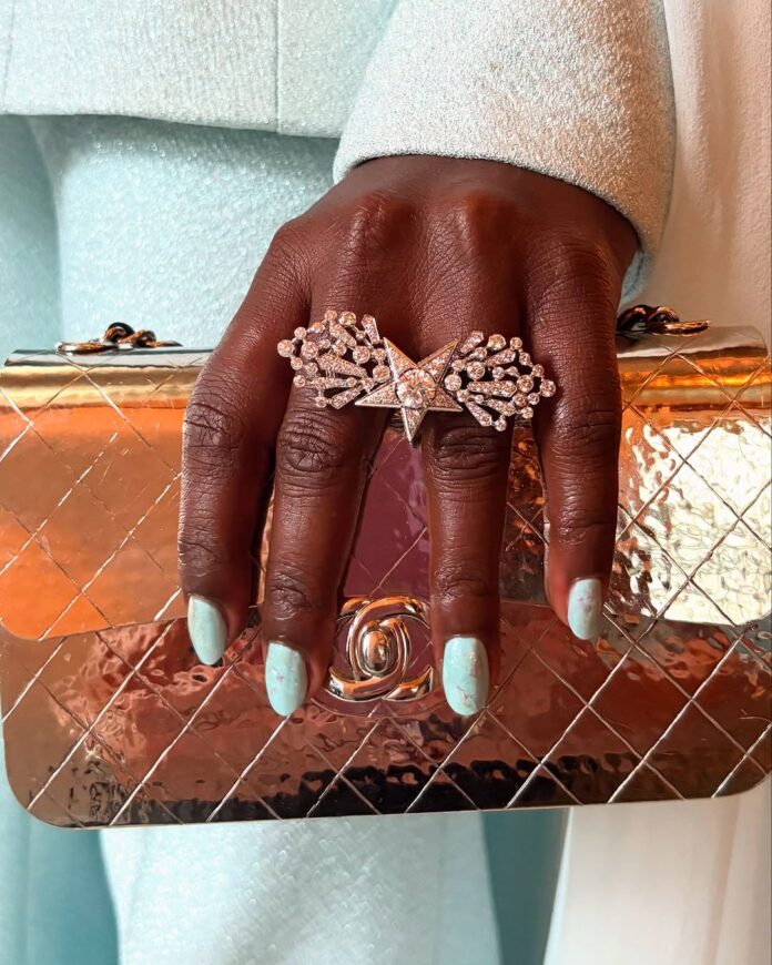 เล็บสีฟ้าของ Lupita Nyong’o โดย Vanessa Sanchez McCullough ถูกเเต่งเเต้มด้วยประกายสีทอง iridescent ยังสะท้อนถึงนวัตกรรมและความหลากมิติของสไตล์แบบสไตล์สีดำจับคู่เข้ากับเฉดสีชุดของเธอจากชาแนลได้อย่างลงตัว