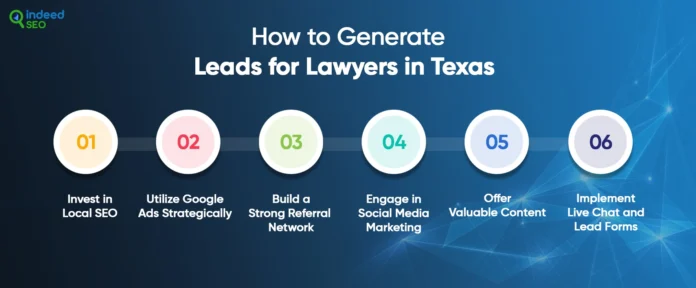 กลยุทธ์การสร้างผู้นำที่ประสบความสำเร็จสำหรับ บริษัท กฎหมายเท็กซัสรวมถึง การเพิ่มประสิทธิภาพกลไกค้นหา (search engine optimisation) จะมองเห็นได้มากขึ้นในการค้นหา ใช้งานได้ง่าย จ่ายต่อคลิก (PPC) โฆษณาสำหรับผู้ที่ต้องการความช่วยเหลือทางกฎหมายอย่างเร่งด่วน การตลาดเนื้อหาสร้างความน่าเชื่อถือใน บริษัท กฎหมายและให้ข้อมูลที่เป็นประโยชน์แก่ลูกค้าที่มีศักยภาพ