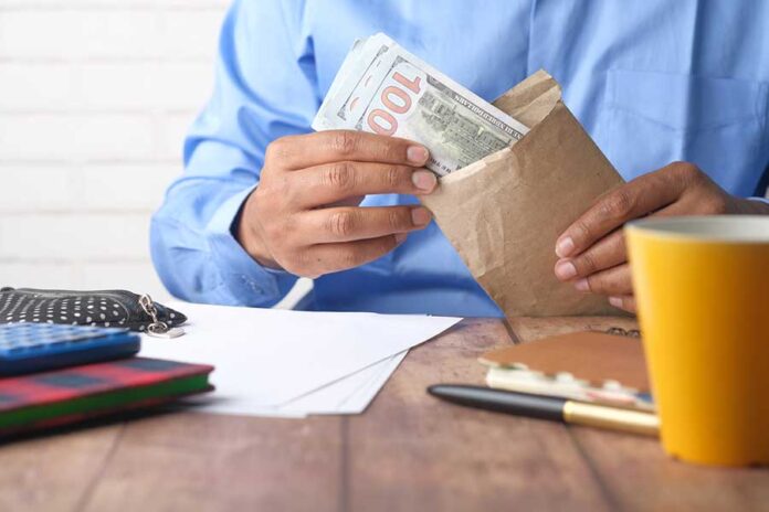ผู้ชายใส่เงินสดในซองจดหมาย