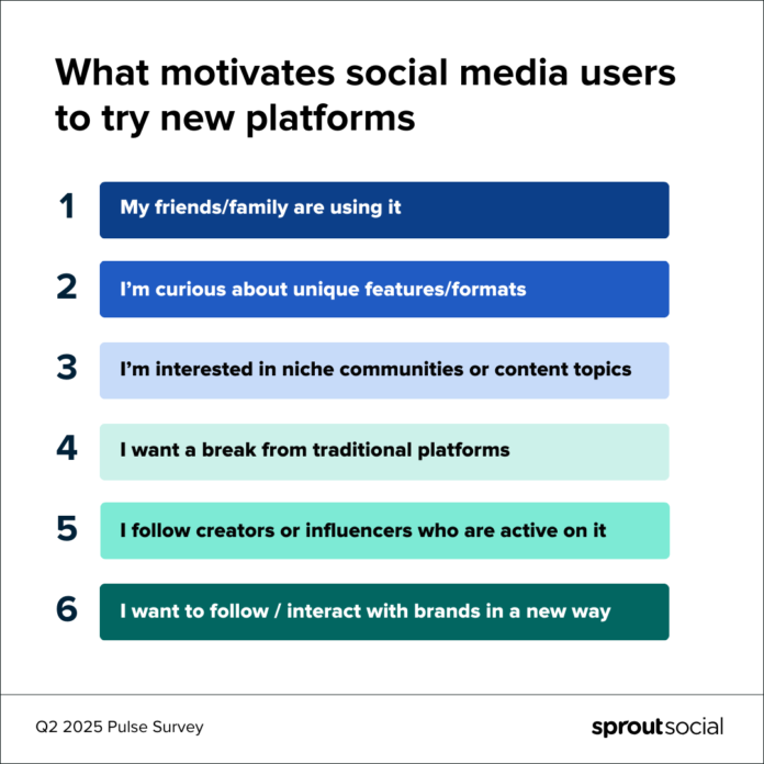 ข้อมูลล่าสุดของ Sprout แสดงให้เห็นว่าผู้ใช้โซเชียลมีความกระตือรือร้นที่จะเพิ่มเวลาในแพลตฟอร์มชุมชนเช่น สีแดง ในระยะเวลาอันใกล้นั้นมีพื้นที่มากกว่าที่ตั้งขึ้นใหม่เช่น บลูส์สกี้ หรือ Mastodon โดยไม่คำนึงถึงประเภทแพลตฟอร์ม Gen Z และ Millennials มักจะผลักดันการรับเลี้ยงบุตรบุญธรรม ผู้ใช้ชายก็มีแนวโน้มมากกว่าผู้ใช้หญิงที่ต้องการทดสอบแพลตฟอร์มเหล่านี้