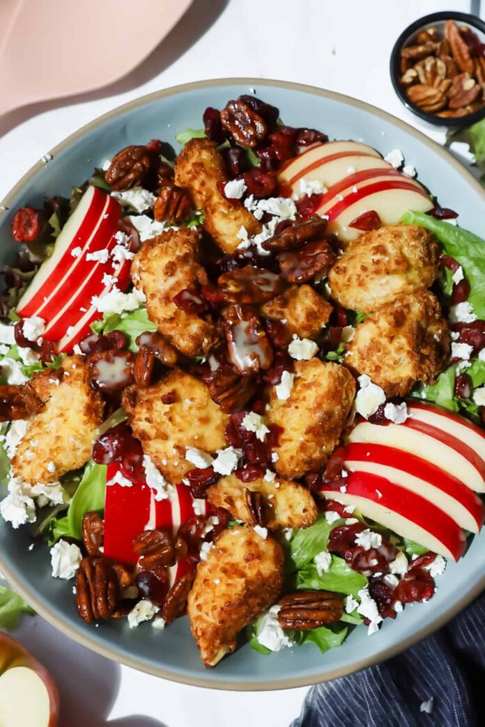 สลัดกับชิ้นไก่ชุบเกล็ดขนมปัง, แอปเปิ้ลสีแดงหั่นบาง ๆ , พีแคน, แครนเบอร์รี่แห้ง, ผักกาดหอมและชีสพังทลาย, ราดด้วยน้ำสลัดในชามสีเทา