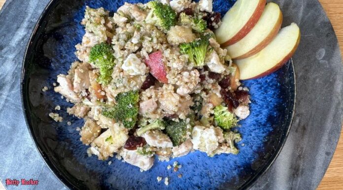 - เพิ่ม quinoa ปรุงสุกและไก่ที่ปรุงสุก (คุณสามารถสับมันได้อย่างประณีตมากขึ้นหากต้องการ) ลงในส่วนผสมของบรอกโคลีและแอปเปิ้ลและโยนเพื่อรวมเข้าด้วยกัน เพิ่มแครนเบอร์รี่และชีส