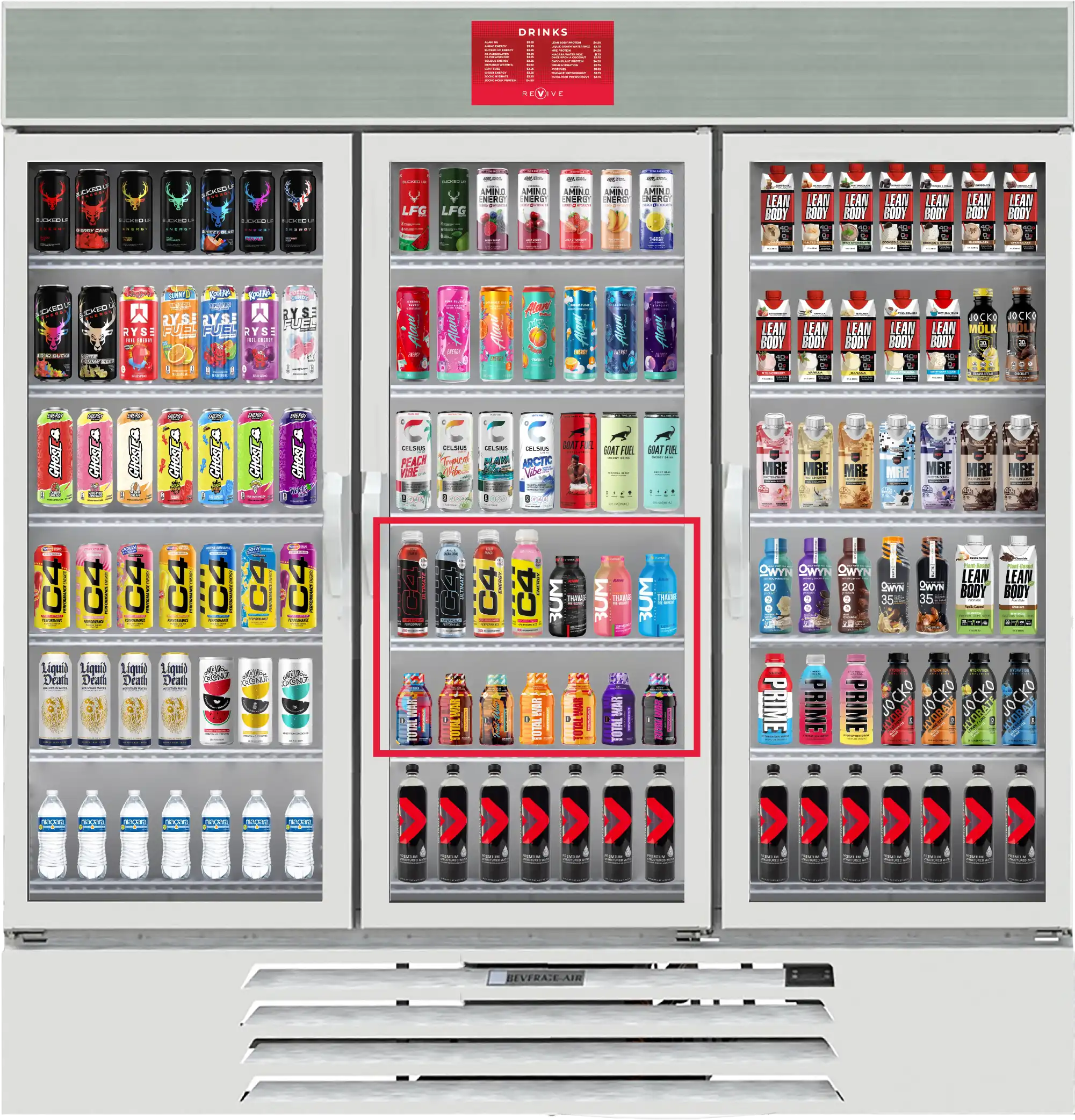 คุณสามารถหาเครื่องดื่มก่อนออกกำลังกายได้ใน Revive Cooler ของเราในพื้นที่ที่ระบุไว้ในสีแดงในกราฟิกด้านล่าง ผงก่อนการออกกำลังกายของเราสามารถพบได้สำหรับการซื้อบนชั้นวางฟื้นฟูของเรา