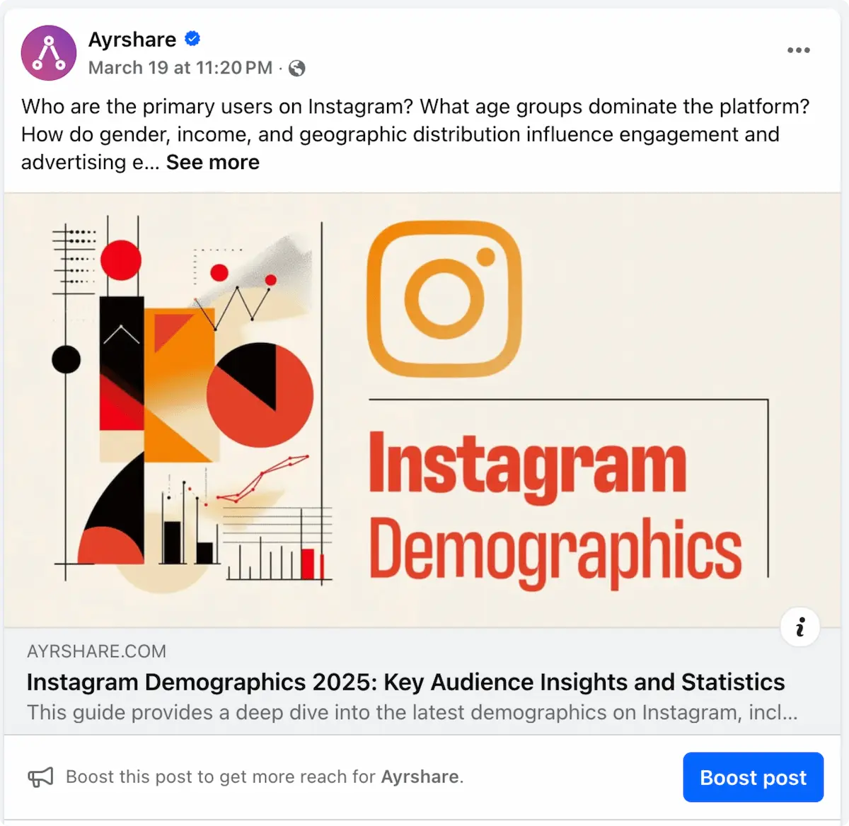 ตอนนี้ Ayrshare เสนอความสามารถในการ แปลงโพสต์ Fb เป็นโฆษณาโดยใช้ ADS APIเรียกว่าโพสต์ที่เพิ่มขึ้น