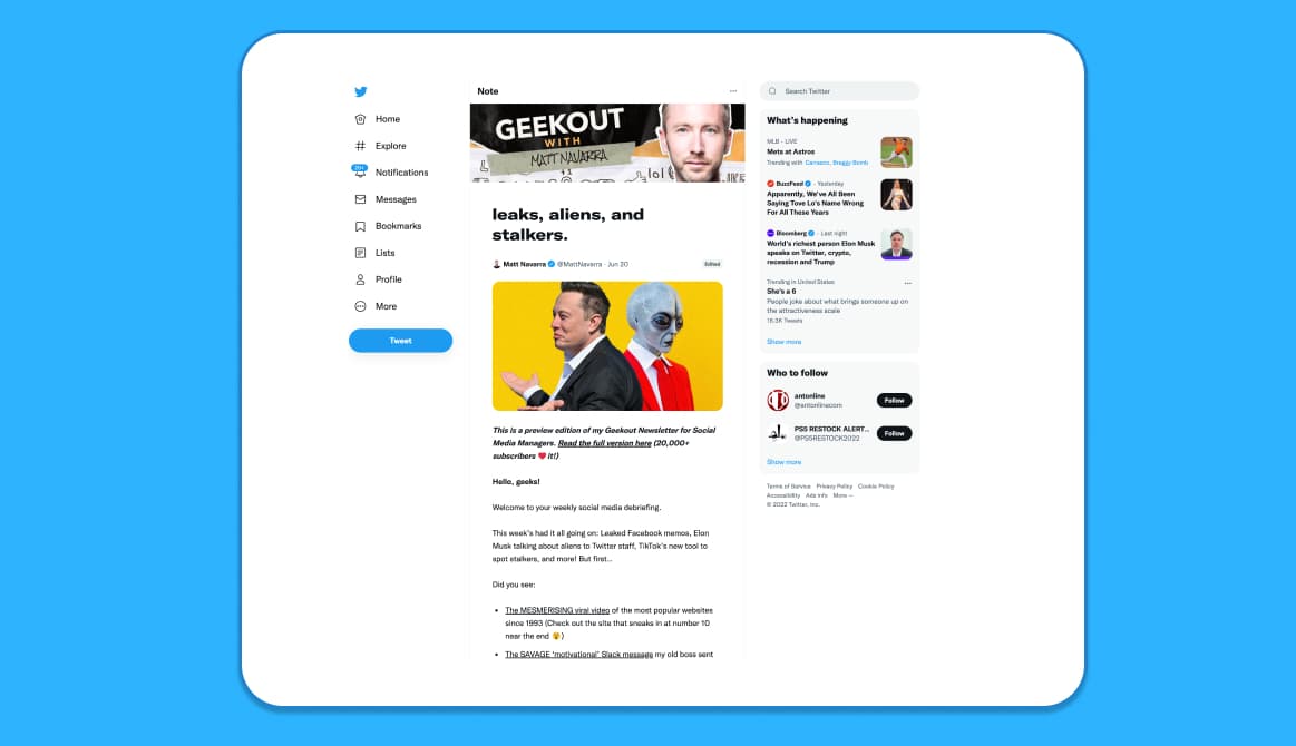 เรารู้สึกตื่นเต้นเกี่ยวกับบันทึก Twitter มันเป็นส่วนเสริมใหม่ที่ยอดเยี่ยมในแพลตฟอร์ม Twitter ทำให้นักเขียนควบคุมได้มากขึ้นในขณะที่เปิดศักยภาพสำหรับเนื้อหารูปแบบที่ยาวขึ้น