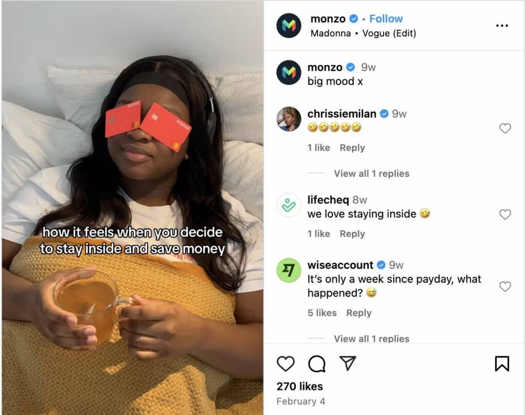 กระนั้นธนาคาร Monzo โดดเด่นสำหรับการปรากฏตัวทางสังคมที่ยอดเยี่ยมของพวกเขา ไม่ใช่แค่ สำหรับแบรนด์การเงินแต่ในบรรดาแบรนด์ทั้งหมด ด้วยผู้ติดตามเกือบ 1 ล้านคนในแพลตฟอร์ม Monzo ได้รับความภักดีและน่าประทับใจ เสียงที่เกี่ยวข้องมีความเกี่ยวข้องและมักจะไม่เคารพพิสูจน์ว่าข้อ จำกัด ทางการเงินบริการเผชิญกับการสร้างโอกาสที่ยิ่งใหญ่ที่สุดสำหรับความคิดสร้างสรรค์ทางสังคม