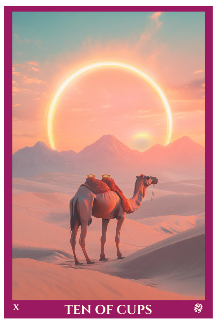 ไพ่ทาโรต์ในสัปดาห์นี้คือ สิบถ้วย: เติมเต็มอารมณ์หยั่งรากลึกและจัดเรียงอย่างสวยงาม ในภาพเด่นของเราอูฐวางอยู่ใน ทะเลทรายซาฮาร่า ภายใต้ส่วนโค้งที่สดใสของแสงสีทองเช่นภาพลวงตาที่สร้างขึ้นจริง หลังจากการเดินทางอันยาวนานอูฐก็มาถึงความนิ่ง: ไม่ใช่ความสำเร็จที่ดัง แต่ความสงบสุขระดับจิตวิญญาณที่เงียบสงบของการรู้ว่าคุณมาถึงตรงไหนที่คุณตั้งใจจะอยู่
