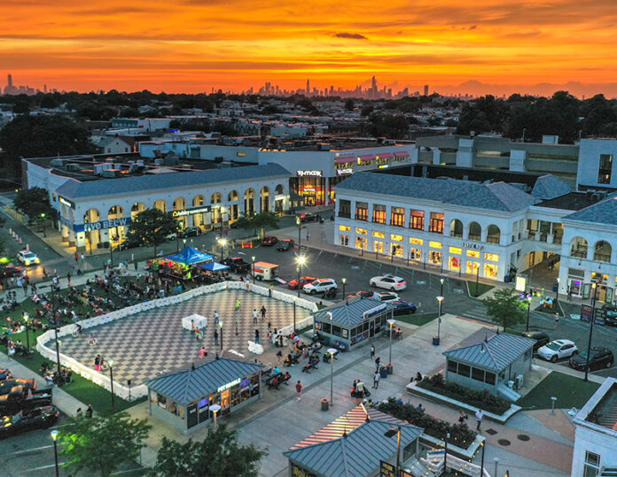 มุมมองเหนือศีรษะของร้านค้าที่ Atlas Park ตอนพระอาทิตย์ตก