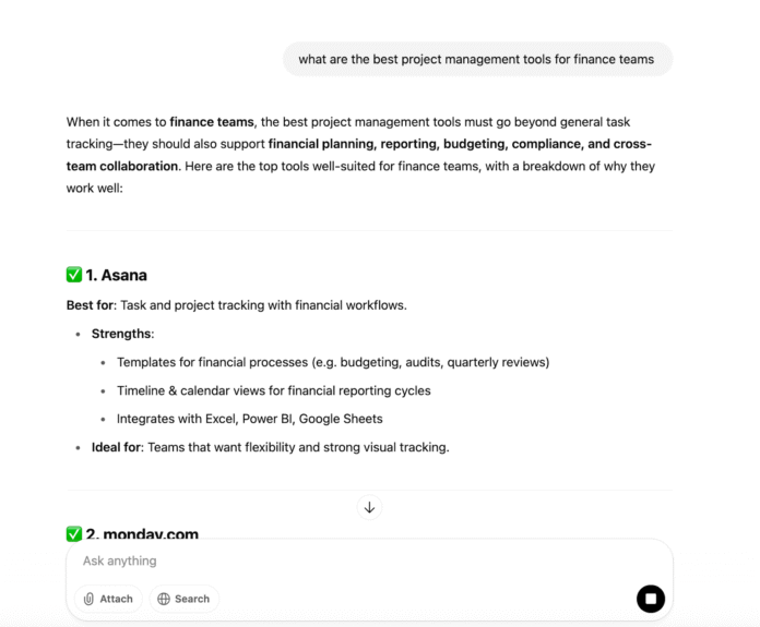 For instance, for those who promote a challenge administration software for finance groups, you need your model to look when somebody asks ChatGPT, “What’s the very best challenge administration software program for finance groups?”