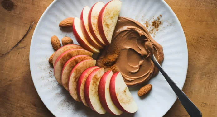 ชิ้นแอปเปิ้ลกับอัลมอนด์บัตเตอร์และอบเชย